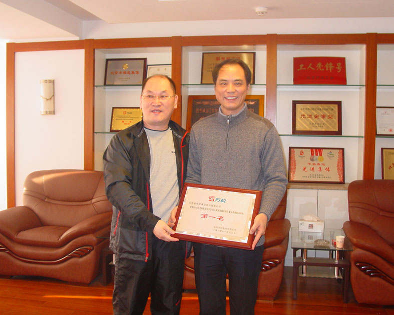 北京萬科領導親赴北京公司授牌 時間:2010-12-14 5214 北京公司在萬科地產第三季度萬科北京區域在建項目產品質量評估中,萬科藍山項目經專家現場實測實量,390個點合格率為99.39%,觀感質量評分、質量風險評估綜合得分97.35%,項目綜合排名蟬聯第一。12月12日上午,北京萬科副總經理孔祥明率工程部經理、項目總經理等一行,特地趕到我公司,把第一名的獎牌隆重授予我公司陳榮春總經理。陳總對萬科的肯定和信任表示感謝,并期望雙方進一步加強友好合作,永續真誠友誼。