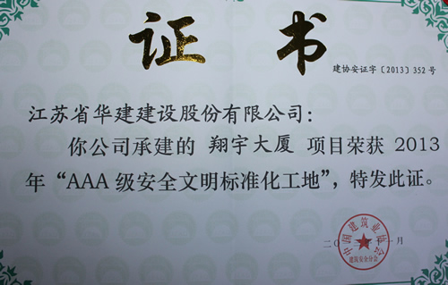 公司首獲全國“AAA級安全文明標準化工地” 時間:2013-12-12 5024 日前,由上海區域公司蘇北分公司承建的淮安翔宇大廈被中國建筑業協會評為2013年全國“AAA級安全文明標準化工地”,這是國內安全文明施工最高獎項,旨在規范建筑施工安全生產,保障建筑職工安全與健康,提高施工現場安全管理水平。這是上海區域公司第一次獲此殊榮,也是江蘇華建第8項全國3A級安全文明標準化工地,該工程還被評為2012年度江蘇省建筑施工文明工地、2013年度江蘇省建筑業新技術應用示范工程。