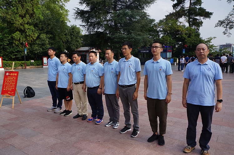 在遵義紅軍山烈士陵園,全體人員為在革命戰(zhàn)斗中犧牲的紅軍戰(zhàn)士敬獻(xiàn)了花圈,對面黨旗莊嚴(yán)宣誓,重溫入黨誓詞。