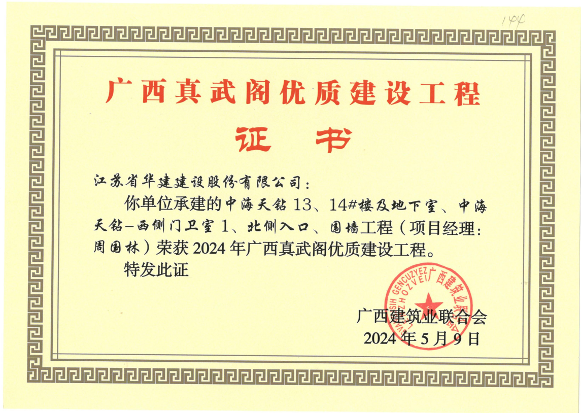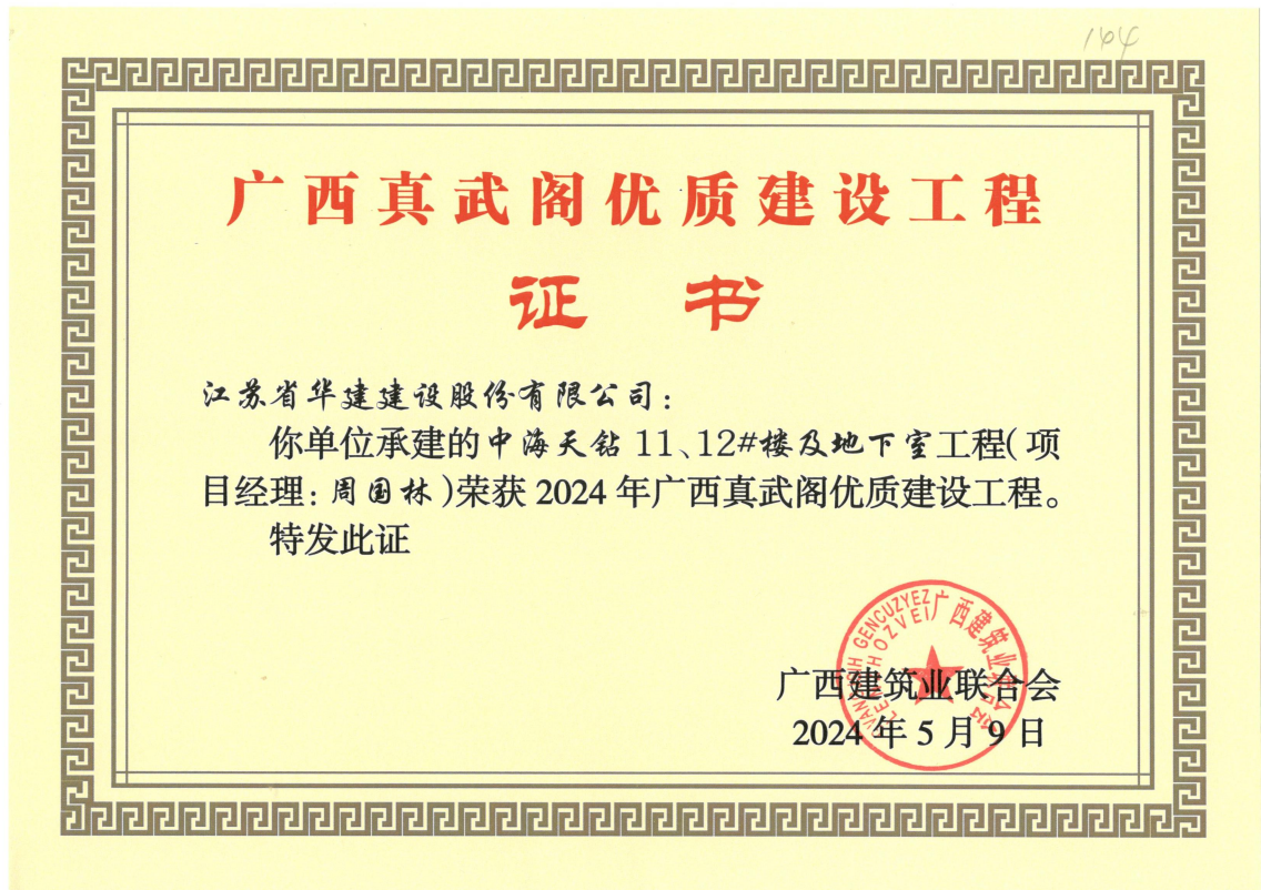 近日傳來喜訊,江蘇華建北京分公司三項工程榮獲質量獎。中海天鉆13、14#樓及地下室、北側入口、圍墻工程和中海天鉆11、12#樓及地下室分別獲2024年廣西建設工程“真武閣杯”獎;中海望京府1#樓工程獲包頭市“金鹿杯”獎。