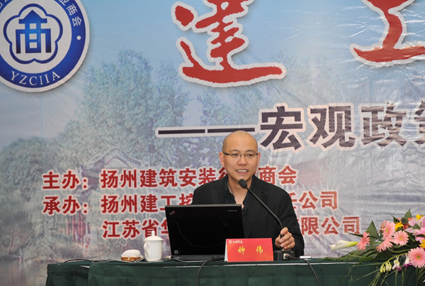 4月29日下午,由揚州市建筑安裝行業商會主辦,揚州建工控股有限責任公司、江蘇省華建建設股份有限公司承辦的首期建工大講堂在揚州西園大酒店開講。本次大講堂邀請的是著名經濟學家鐘偉教授作為主講嘉賓。鐘教授圍繞宏觀政策撲朔,房地產中期調整為主要內容對2010年經濟復蘇中的風險和調控進行了分析和解讀。針對美國經濟和中國經濟形勢和走向,房地產市場格局、特點等熱點,鐘教授作了精彩論斷,觀點精辟獨到、信息詳實豐富、語言生動風趣,讓與會者開闊了視野,增長了見識,最后鐘教授還和與會人員進行了互動,答疑解惑,給人留下深刻印象。