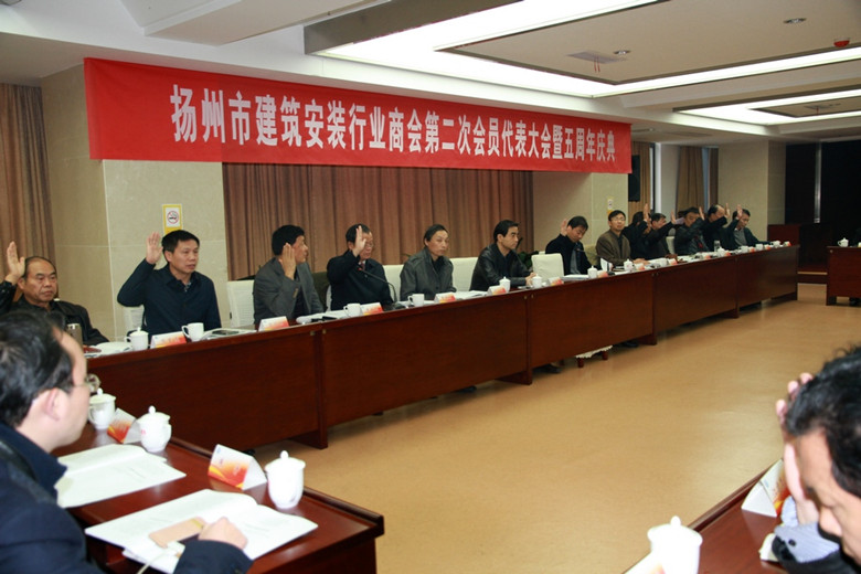 陸金龍主持會員代表大會,第一屆理事會常務副會長吳士茂作了工作報告,吳士茂作為第二次會員代表大會籌備小組負責人還作了關于商會換屆選舉情況的說明。大會通過舉手表決的方式選舉產生了第二屆理事會和理事會領導機構。36名理事組成第二屆理事會,陸金龍連任當選第二屆理事會會長,吳士茂任常務副會長,曹德榮等9名同志任副會長。趙振東宣讀了市工商聯、總商會關于同意揚州市建筑安裝行業商會換屆選舉結果的批復。大會舉行了會長單位、副會長單位和理事單位授牌儀式。任壽松代表兄弟友好商會、張紹華代表市民政局分別致賀辭。