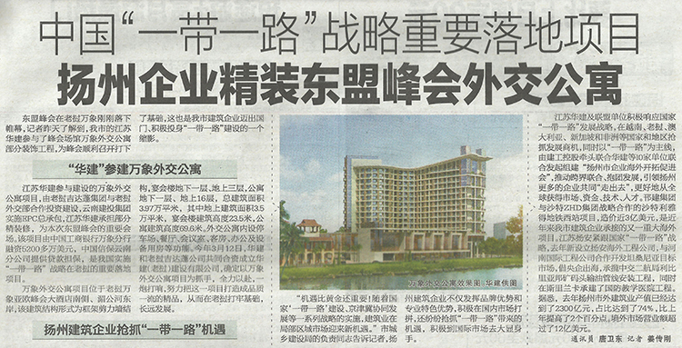 近日,東盟峰會在老撾萬象剛剛落下帷幕。912日,《揚州晚報》A7版刊載題為《中國“一帶一路”戰(zhàn)略重要落地項目  揚州企業(yè)精裝東盟峰會外交公寓》的文章,詳細報道華建積極踐行國家“一帶一路”戰(zhàn)略,承建東盟峰會場館萬象外交公寓精裝修工程的有關(guān)情況。