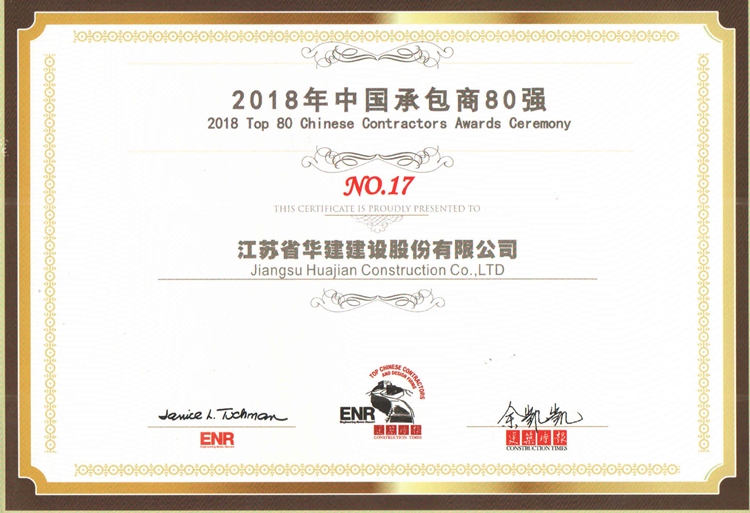 11月8日,由美國《工程新聞記錄》(簡稱ENR)和中國《建筑時報》主辦的2018年“中國承包商80強和工程設計企業(yè)60強”排名正式揭曉,江蘇華建再次入選中國承包商80強榜單,列第17位。