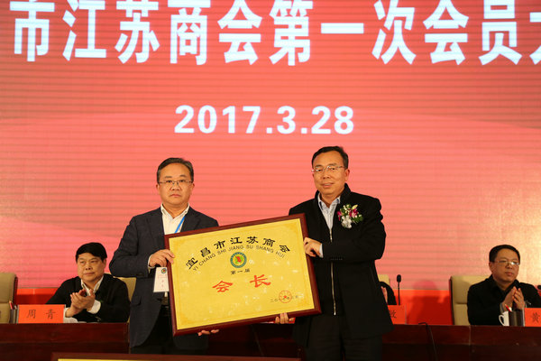 宜昌市委常委、統戰部長、市總工會主席王均成,市人大常委會副主任周青,市政府副市長黃黎明,市政協副主席、市工商聯主席張發衛以及江蘇省工商聯、揚州市工商聯、公司監事會主席吳士茂等領導出席成立大會,并為宜昌市江蘇商會揭牌。