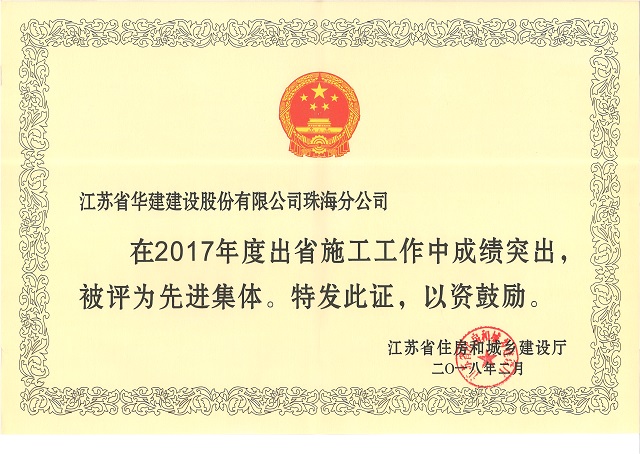 3月24日上午,江蘇省人民政府駐深圳(廣州)辦事處和江蘇省住房和城鄉建設廳在廣東深圳召開2017年度江蘇建筑業南方區工作會議。會上,珠海公司被江蘇省住房和城鄉建設廳表彰為2017年度江蘇出省施工先進集體, 珠海分公司總經理呂方達、陽江分公司副總經理余新江榮獲“出省施工先進個人”稱號。