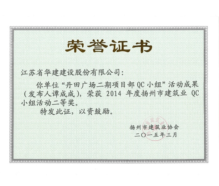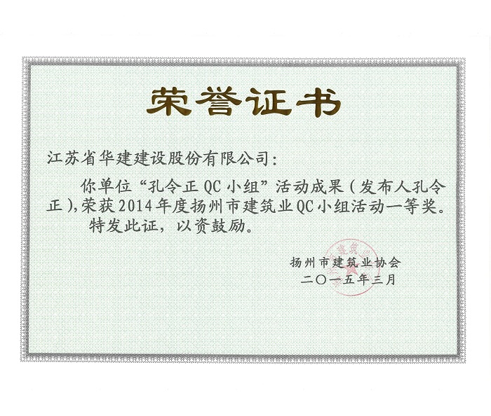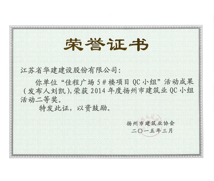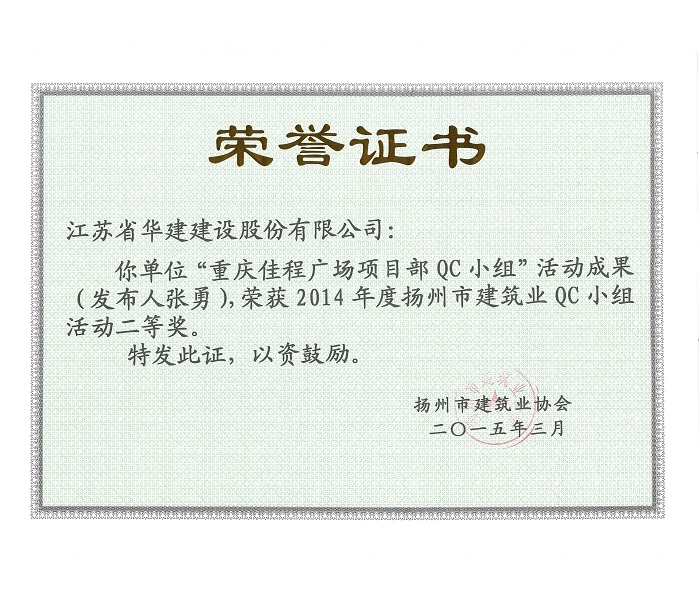公司5項成果獲揚州市建筑業QC成果獎 時間:2015-03-31 4785 近日,揚州市建筑業協會發文表彰了2015年度全市建筑業QC小組活動成果獎,公司共有5項成果獲獎,其中,“孔令正QC小組”活動成果《剝蝕丘陵地貌多形截面鋼筋混凝土灌注樁施工新方法》榮獲一等獎,“佳程廣場5#樓項目QC小組”活動成果《提高核心筒筒體結構施工質量》、“重慶佳程廣場項目部QC小組”活動成果《提高現澆混凝土樓梯結構施工質量》、“丹田廣場二期項目部QC小組”活動成果《提高蒸壓加氣混凝土砌塊外墻合格率》榮獲二等獎,“馬賽公館項目部QC小組”活動成果《 提高耐磨金剛砂地面施工質量》榮獲三等獎。