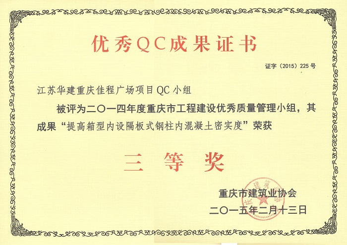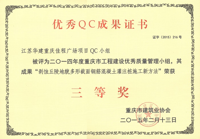 公司3項QC成果榮獲重慶市三等獎 時間:2015-04-02 4656 近日,重慶市建筑業協會發文表彰了一批優秀QC成果,公司重慶佳程廣場項目QC小組被評為2014年度重慶市工程建設優秀質量管理小組,其成果“提高箱型內設隔板式鋼柱內混凝土密實度”、“剝蝕丘陵地貌多形截面鋼筋混凝土灌注樁施工新方法”、“重慶佳程廣場基礎工程大體積混凝土裂縫成因分析和預控”等均榮獲三等獎。