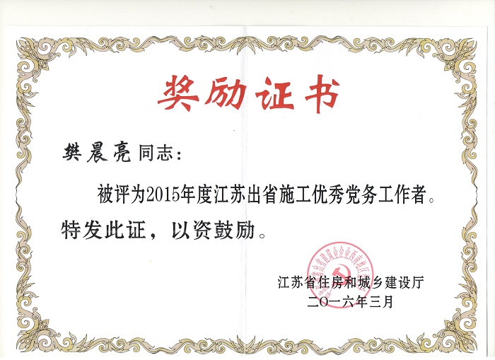 重慶分公司被表彰為“2015年度江蘇出省施工先進企業” 時間:2016-04-20 2958 近日,重慶分公司被江蘇省住房和城鄉建設廳表彰為“2015年度江蘇出省施工先進企業”,重慶分公司總經理嚴正濤榮獲“2015年度江蘇出省施工優秀企業經理”稱號,樊晨亮被評為“2015年度出省施工優秀黨務工作者”。