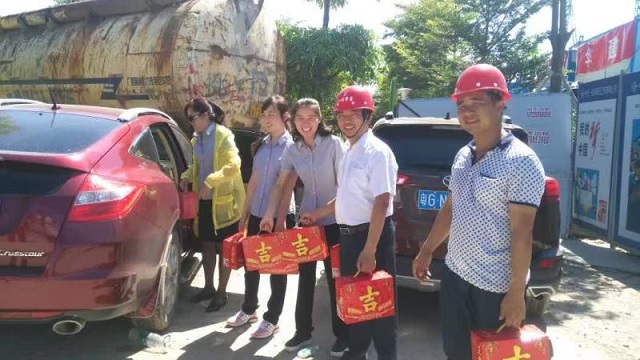 炎炎夏日送清涼 時間:2016-08-01 3799 7月30日上午,珠海分公司橫琴隆義廣場項目部工地熱浪朝天,機聲隆隆,人來人往,一派繁忙景象。一支由江蘇華建直五項目部和橫琴隆義投資公司共同組成的“送清涼”小分隊也在工地上奔忙著,項目經(jīng)理姚寧與投資公司負責人王艷、許珂等正在將一箱箱王老吉飲料有條不紊地送到建筑工人手中,讓廣大一線職工在炎炎烈日下感受到陣陣清涼。