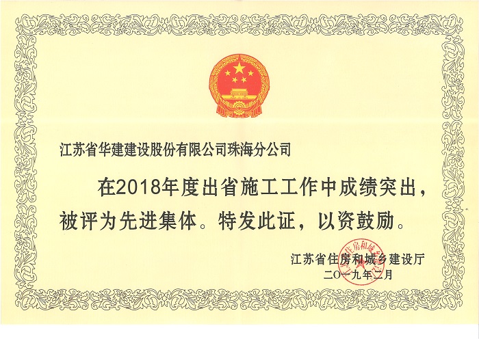 公司獲評2018年度江蘇出省施工先進集體
