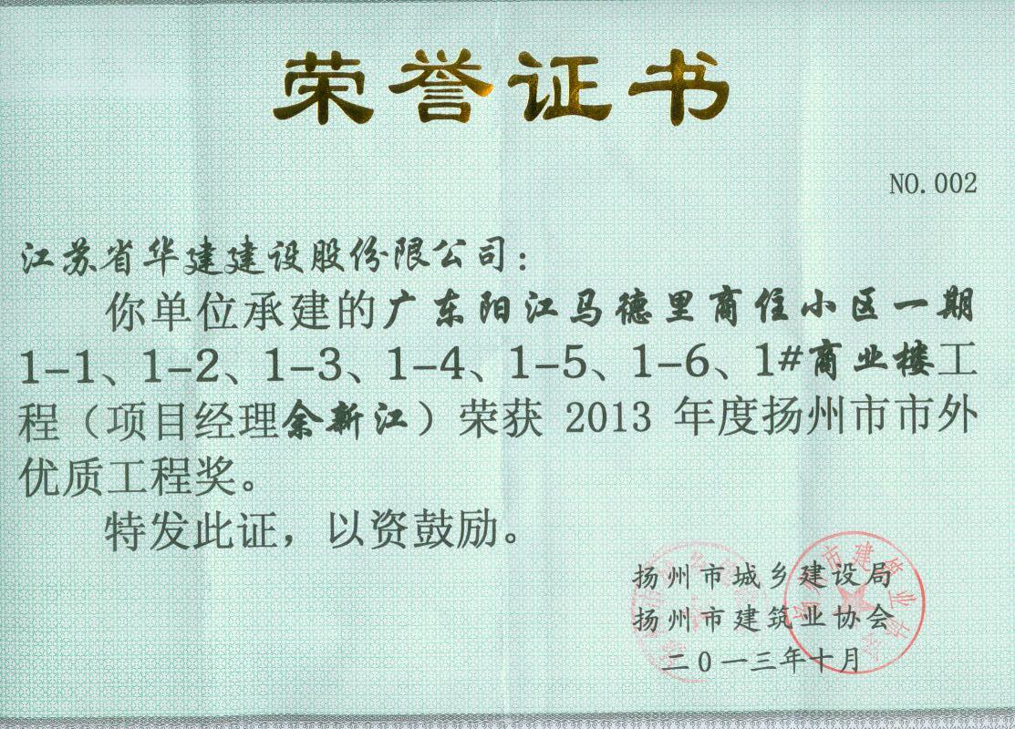 2013年陽江陽光馬德里項目揚州市市外優質工程獎