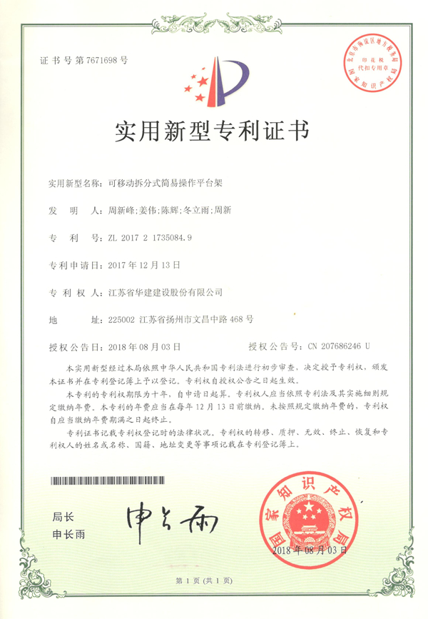 近日,從國家知識(shí)產(chǎn)權(quán)局傳來喜訊,北京公司發(fā)布的《可移動(dòng)拆分式簡易操作平臺(tái)架》(專利號(hào):ZL...