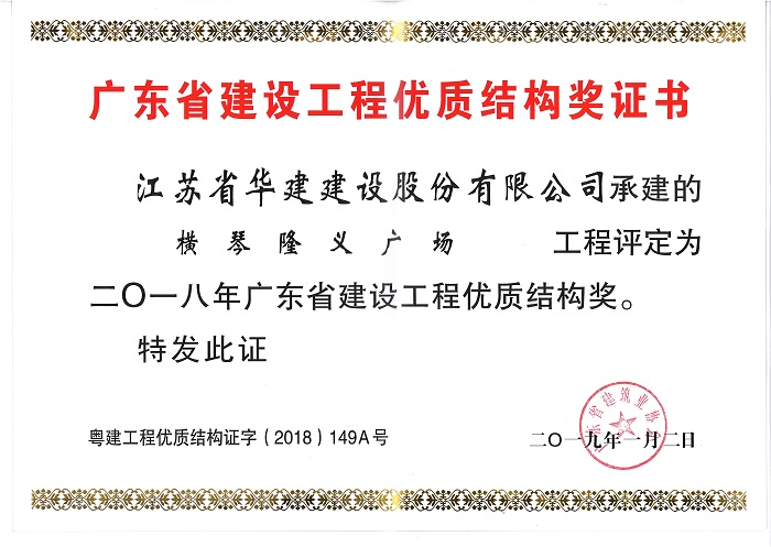 隆義廣場獲2018年廣東省建設工程優質結構獎