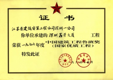 荔景大廈獲:深圳市優(yōu)質(zhì)樣板工程(第一名)、江蘇省優(yōu)工程(金牌)、江蘇省揚(yáng)子杯獎(jiǎng)、江蘇省名牌工程、揚(yáng)州市瓊花杯獎(jiǎng)、1996年度建筑工程魯班獎(jiǎng)。