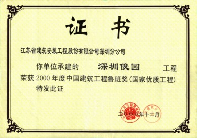 深圳俊園獲98年深圳市文明工地,99年獲江蘇省優(yōu)質(zhì)工程金獎,同年被授江蘇省建筑業(yè)新技術(shù)應用示范工程,2000年獲江蘇省“揚子杯”獎,深圳市優(yōu)質(zhì)樣板工程第一名和金牛獎及全國建筑業(yè)最高獎“魯班獎”。
