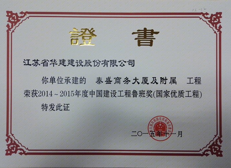 泰盛商務大廈及附屬工程地處秦皇島市經(jīng)濟開發(fā)區(qū)核心位置,集商務辦公、會議中心、一站式服務大廳及報告演藝廳等功能為一體的綜合類商務辦公樓,地下1層,地上23層,裙樓兩層,建筑面積90148㎡,建筑高度97.75米。工程先后榮獲全國建筑業(yè)綠色施工示范工程、江蘇省新技術應用示范工程、江蘇省省級工法、河北省結構優(yōu)質工程獎、河北省建設工程安濟杯獎(省優(yōu))、全國優(yōu)秀項目管理成果獎、全國優(yōu)秀QC小組成果一等獎。2015年,被中建協(xié)評為2014-2015年度中國建設工程魯班獎(國家優(yōu)質工程)。
