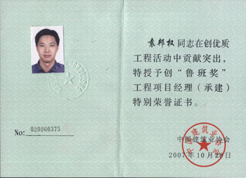 他努力踐行科學發展觀,狠抓施工技術管理,擔任項目經理多年,負責施工的工程屢創佳績,屢獲殊榮,他負責施工的項目達35項之多,建筑面積97萬m2,其中18層以上31幢。工程質量幢幢優良,8項工程獲江蘇省優,1項獲廣東省優工程,6項獲深圳市優,兩項獲深圳市最高質量榮譽“金牛獎”,兩項問鼎中國建設工程最高質量榮譽魯班獎。袁邦權項目部業成為業內有影響的锃亮品牌,先后被授予公司雙文明先進集體、公司思想政治工作先進單位,“江蘇省青年文明號”、“全國青年文明號”等光榮稱號。